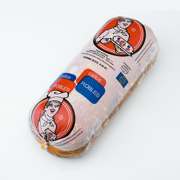 Piezas de 4 Kg. aproximadamente, envasadas en tripa artificial plástica y embaladas en cajas de cartón. Cajas de 4 piezas.