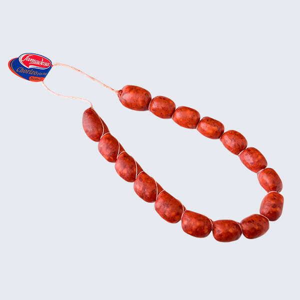 Piezas de 350 g., aproximadamente, embutidas en tripa natural, divididas en 16 porciones (3-4 cm aproximadamente), envasadas en atmosfera protectora con 7 piezas por unidad y embaladas en cajas de cartón conteniendo dos bolsas por caja.